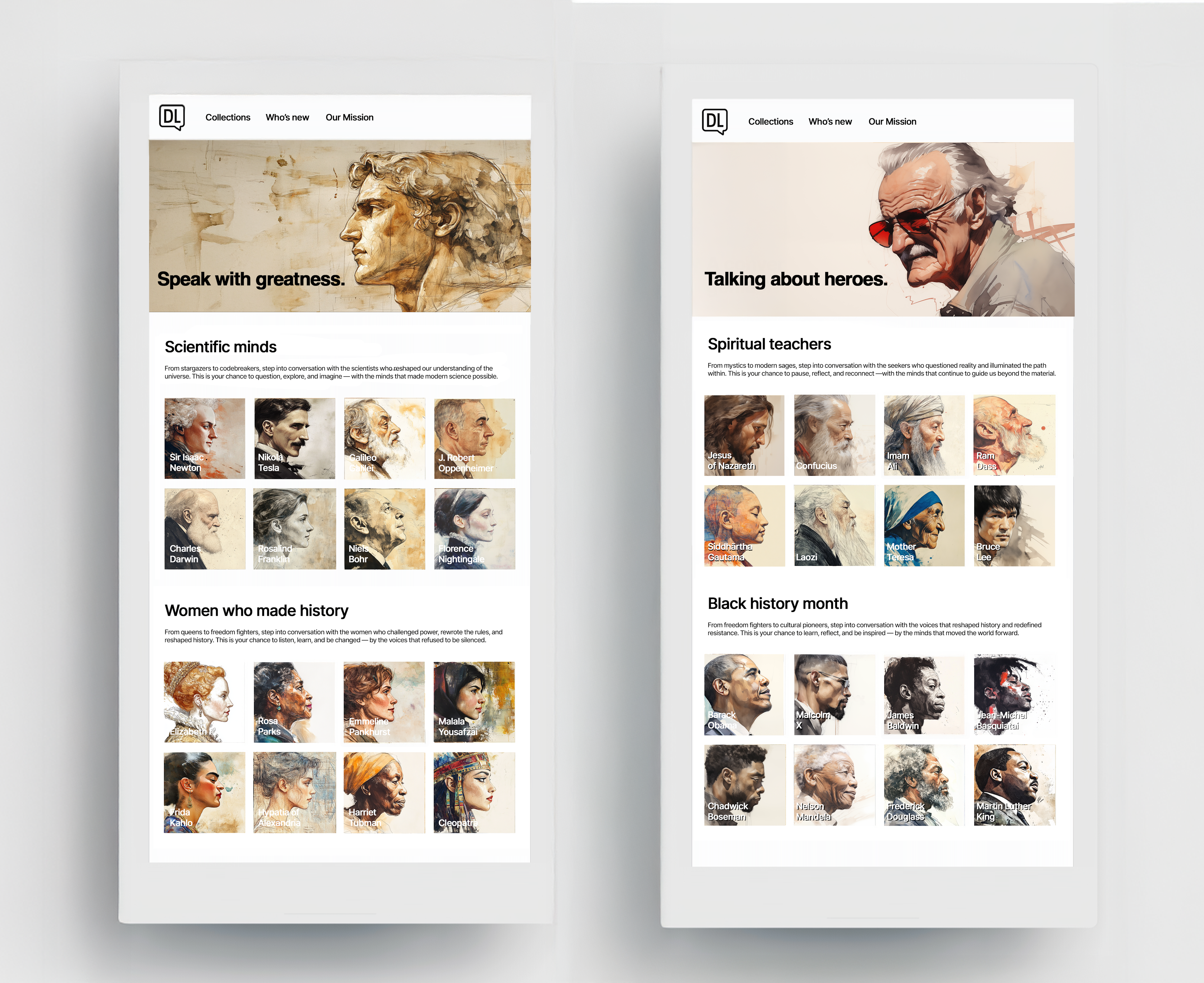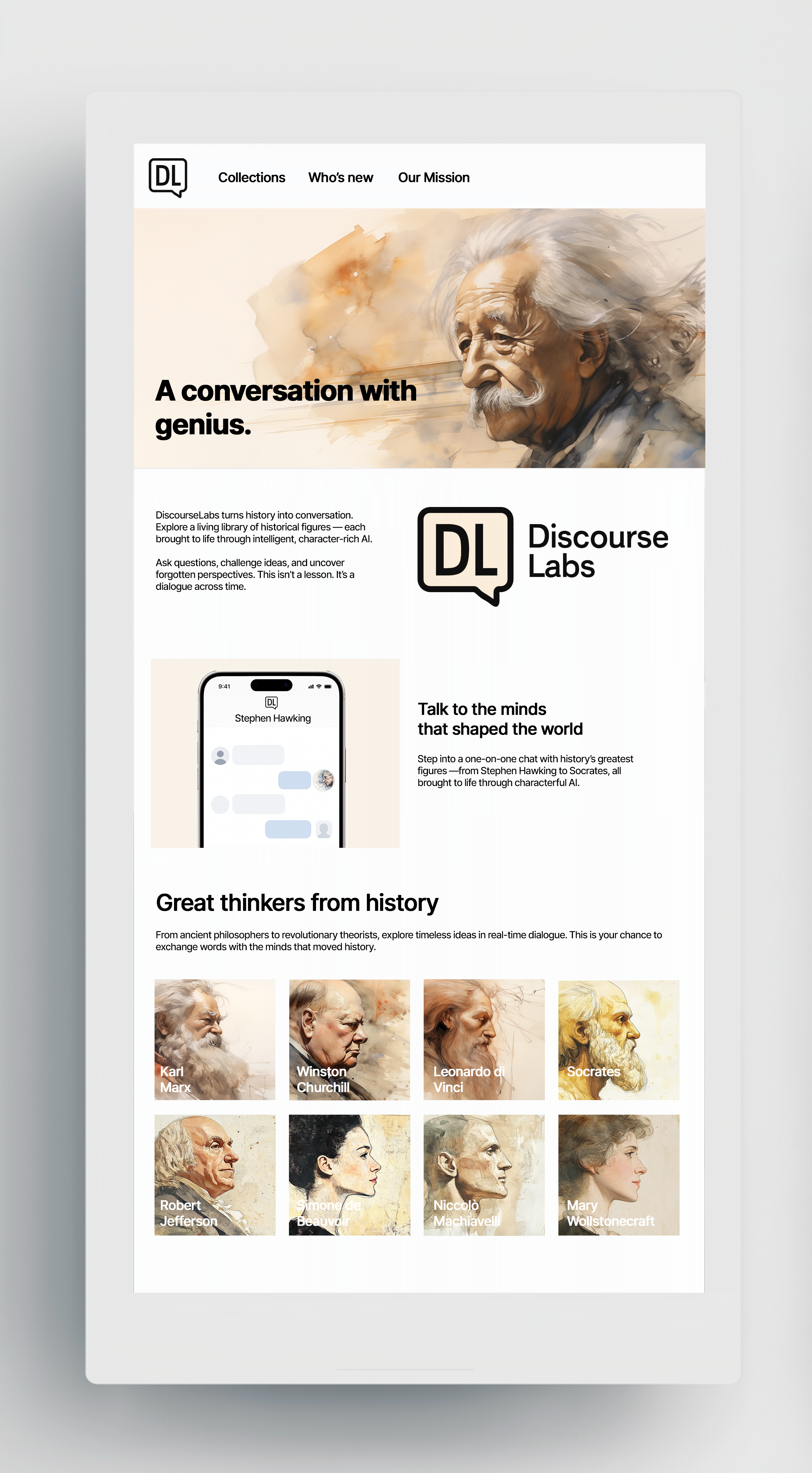 DiscourseLabs is a ChatGPT-powered library of “conversational artefacts”: dynamic, dialogue-ready simulations of historical figures designed to educate through interaction. Rather than offering information in static blocks, each persona invites users into a living exchange —a chance to ask questions, test ideas, and hold conversation with the minds that shaped history.