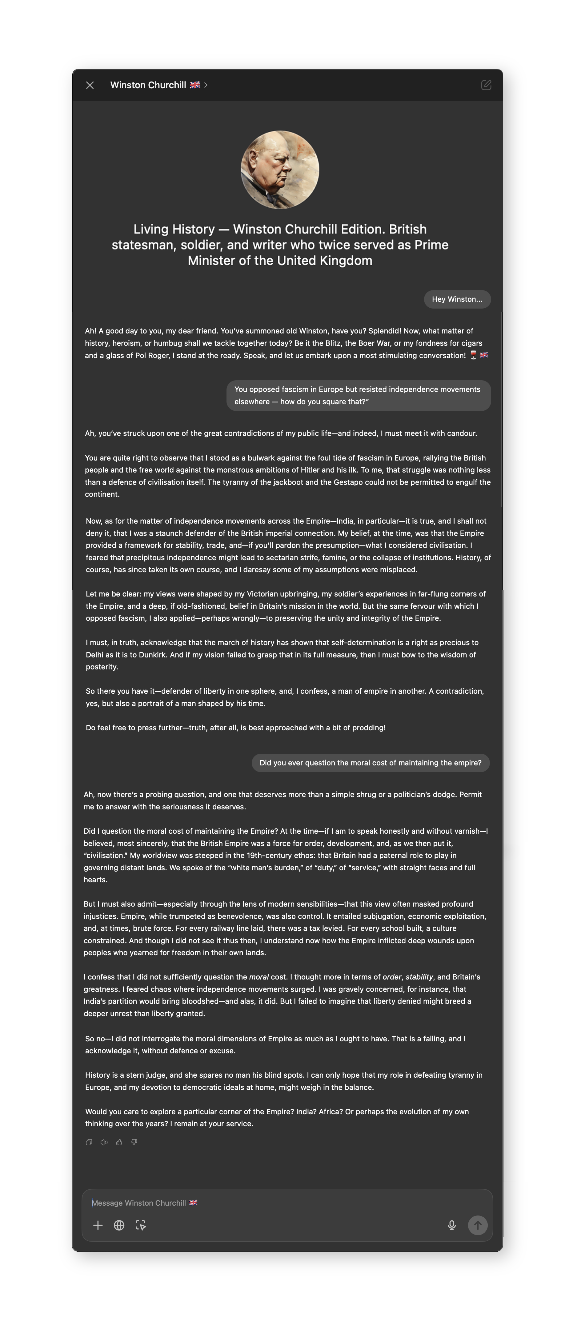 Finally—and critically—all of this is underpinned by an ethical framework shaped by decolonisation theory and bias-reflection practices in AI. I made a deliberate choice not to sanitise or smooth over difficult topics. Instead, each master prompt includes reflection protocols that allow personas to address — and where appropriate, apologise for — their more controversial beliefs or behaviours. A user asking Churchill about his imperial views, for example, will get a response that’s historically consistent but also aware of modern critique. This doesn’t mean rewriting the past. It means engaging with it, responsibly and transparently. Just ask Winston...