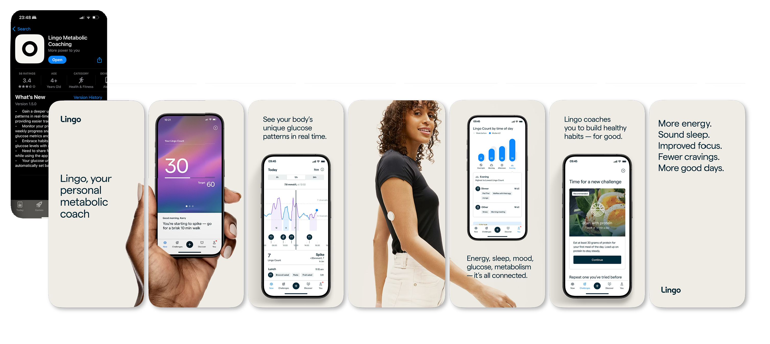We meticulously selected keywords that resonated with individuals searching for innovative health solutions, ensuring that Lingo was not only discoverable but also highlighted for its unique features. The app description was crafted to clearly outline the benefits of the device, emphasising its ability to track and analyze key biomarkers for a more personalised health regimen. We showcased how Lingo leverages advanced meditech to provide insights into glucose variability and ketosis, catering to both individuals managing diabetes and those interested in a deeper understanding of their metabolic health.
