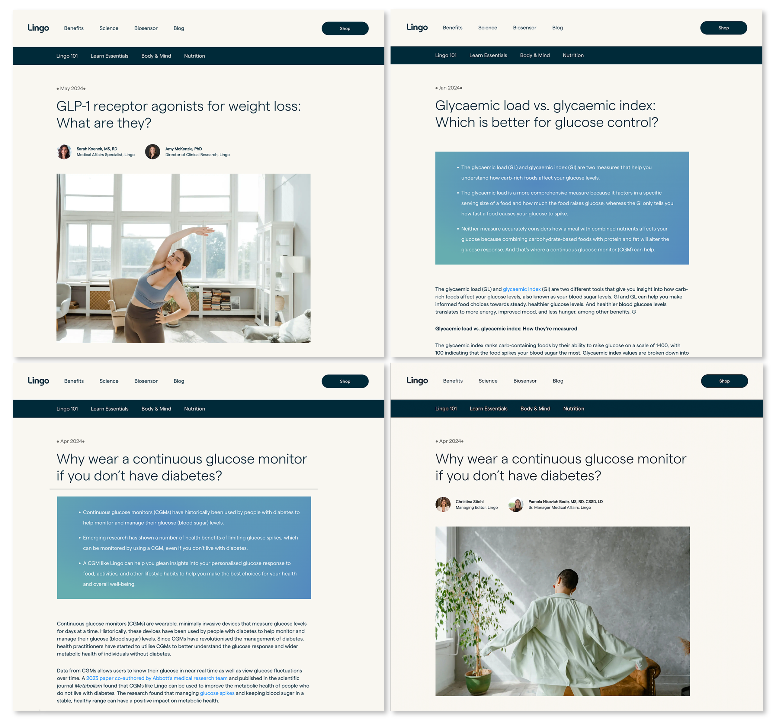 For the Lingo website, our objective was to transform complex scientific knowledge about glucose monitoring and metabolic health into polished, consumer-friendly copy that educates and inspires a broad audience. We distilled these intricate concepts into a clear and compelling value proposition, demonstrating how Lingo enhances everyday health through its continuous monitoring capabilities and real-time insights. This approach not only demystified the technology for potential users but also showed them how Lingo could seamlessly integrate into and improve their daily lives.